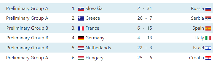 Η Ρωσία κέρδισε 31-2 στο πρώτο παιχνίδι της πρεμιέρας τη Σλοβακία σημείωσε το 5ο ρεκόρ επίτευξης γκολ στη διοργάνωση. Την πρώτη φορά, το 1985 η Ολλανδία είχε σκοράρει 37 γκολ, ενώ το 2018 η Ρωσία είχε σκοράρει 35 γκολ κόντρα στην Τουρκία, για να ακολουθήσουν δύο ακόμη νίκες εναντίον της Τουρκίας στη Βαρκελώνη με 32 γκολ, τόσο από Ολλανδία, όσο και από Ουγγαρία.
