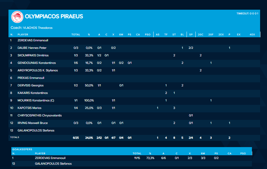 Στο 2:42 ο Σκουμπάκης αποβλήθηκε και ο Πικάρντο κάλεσε τάιμ άουτ. Στο ιταλικό παραπάνω, o Μάνος Ζερδεβάς με μεγάλη απόκρουσε κράτησε το προβάδισμα του Ολυμπιακού στο +2!