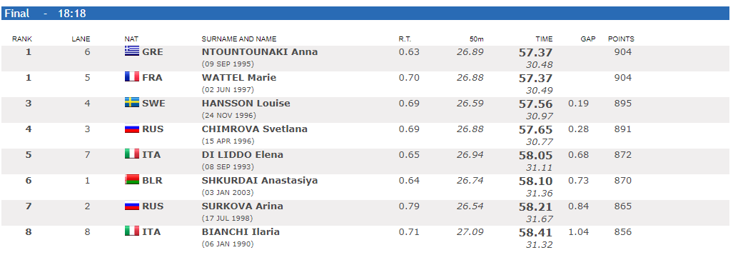 Η Άννα Ντουντουνάκη είναι η νέα πρωταθλήτρια Ευρώπης, χαρίζοντας μια τεράστια επιτυχία στην ελληνική κολύμβηση, με την αθλήτρια από τα Χανιά να ανεβαίνει μαζί στο πρώτο σκαλί του βάθρου με τη Γαλλίδα Μαρί Βατέλ, η οποία έκανε επίσης 57.37. Στο 2ο 50άρι η δύναμη που έβγαλε η Ντουντουνάκη ήταν αδιανόητη και κατάφερε να αφήσει… σκόνη στις αντίπαλους της, κατακτώντας το χρυσό!