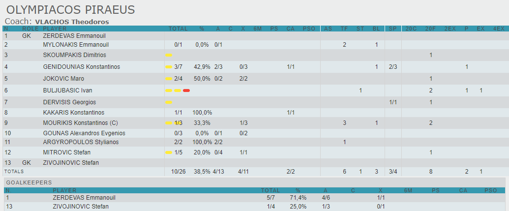 Ο παίκτης παραπάνω ήταν ένας τομέας που δεν βοήθησε τον Ολυμπιακό να ξεφύγει στο σκορ, με τον «Θρύλο» να ολοκληρώνει το παιχνίδι με κακό ποσοστό (4/15), ωστόσο η κίνηση του Θοδωρή Βλάχου να περάσει στον αγώνα τον Μανώλη Ζερδεβά (5/7 αποκρούσεις) στο ημίχρονο στη θέση του Στέφαν Ζιβογίνοβιτς, εν πολλοίς άλλαξε τη ροή της αναμέτρησης και βοήθησε την «ερυθρόλευκη» άμυνα να συμμαζευτεί, δεχόμενη μόλις δύο γκολ σε ολόκληρο το δεύτερο ημίχρονο, σε αντίθεση με τα έξι του πρώτου μισού του ματς.