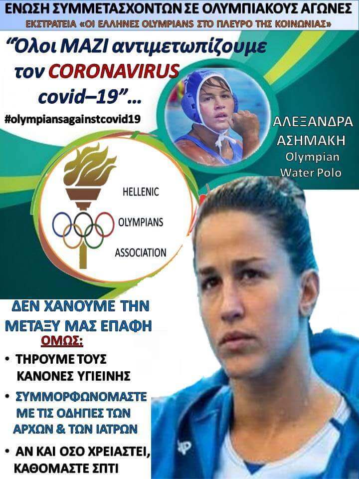 Με το σύνθημα δεν χάνουμε την μεταξύ μας επαφή, αλλά και την παρότρυνση να τηρούμε τους κανόνες υγιεινής, να συμμορφωνόμαστε με τις οδηγίες των αρχών και των ιατρών και να καθόμαστε στο σπίτι αν και όσο χρειαστεί, η Ένωση Συμμετασχόντων σε Ολυμπιακούς Αγώνες εγκαινιάζει την Εκστρατεία «Οι Έλληνες Olympians στο πλευρό της κοινωνίας».