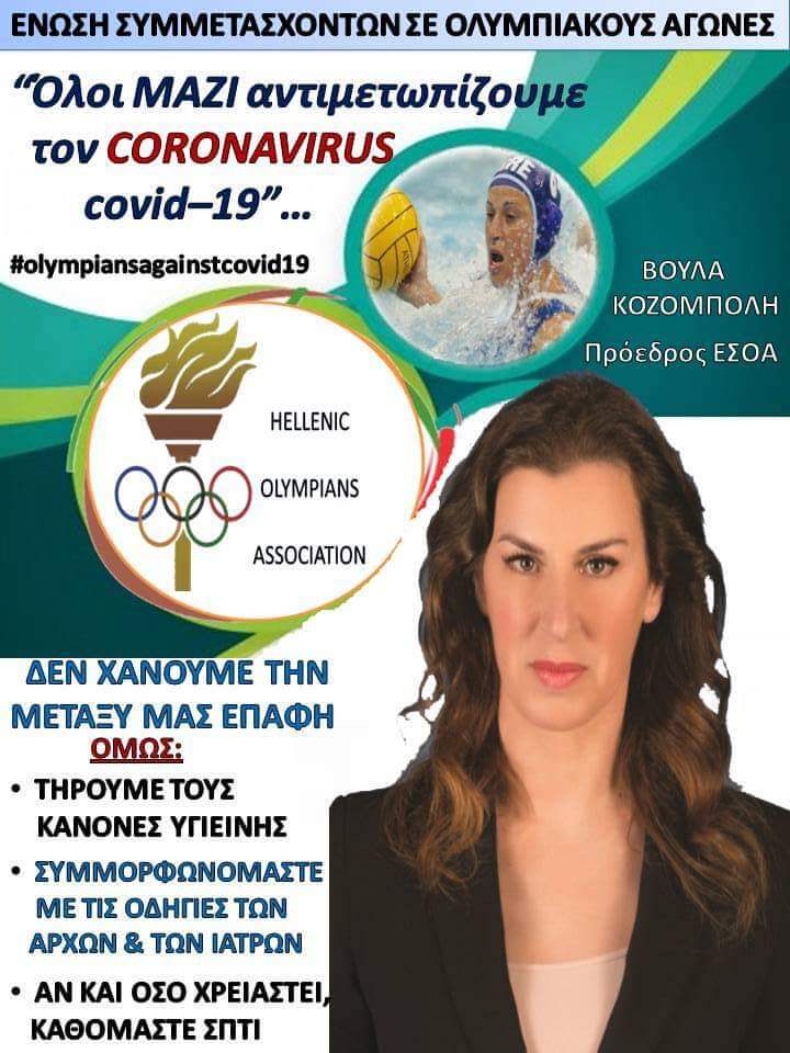 Σε δηλώσεις της, η Πρόεδρος της Ένωσης Συμμετασχόντων σε Ολυμπιακούς Αγώνες και αργυρή Ολυμπιονίκης στη Υδατοσφαίριση Βούλα Κοζομπόλη δήλωσε μεταξύ άλλων: «Σε αυτή τη δύσκολη συγκυρία, η συνοχή και η υπευθυνότητα της κοινωνίας μας είναι πιο απαραίτητη παρά ποτέ. Όλοι μαζί πρέπει να αντιμετωπίσουμε την νόσο του νέου κορονοιού, την οποία ο Παγκόσμιος Οργανισμός Υγείας χαρακτήρισε πανδημία. Έτσι και οι Olympians της Ελλάδας οφείλουμε να συνδράμουμε με όλους τους τρόπους που έχουμε στη διάθεσή μας. Ειδικά οι αθλητές και οι αθλούμενοι να αποφεύγουμε τους κλειστούς χώρους άθλησης και να φροντίζουμε να μην εξουθενώνουμε το σώμα μας και το ανοσοποιητικό μας.