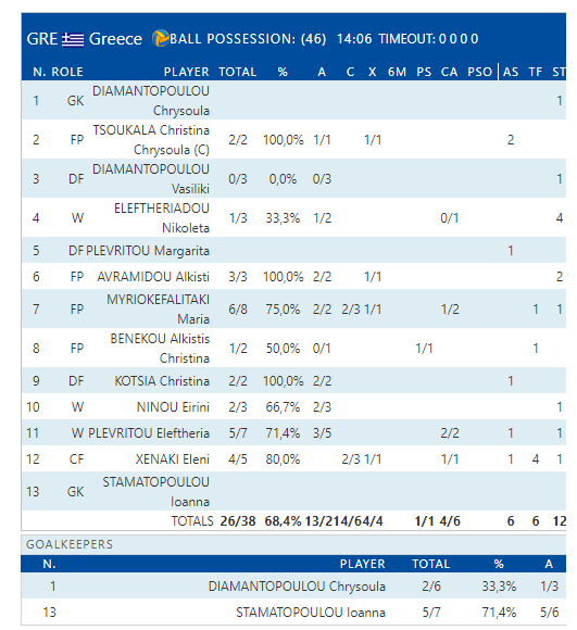 Η Εθνική είχε 70% ευστοχία στον αγώνα. Το τελικό σκορ ήταν το 26-7.