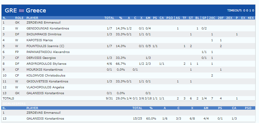 Η Εθνική που αγωνίστηκε χωρίς τον τραυματία στο χέρι Άγγελο Βλαχόπουλο είχε βρει τον τρόπο να προηγείται έως και το τέταρτο οκτάλεπτο, αλλά στη συνέχεια το σκηνικό άλλαξε καθοριστικά, καθώς περίπου 5:30 λεπτά πριν το τέλος ο Μάριος Καπότσης σκόραρε σε παραπάνω, αλλά το γκολ ακυρώθηκε μετά από χρήση VAR, για λόγο που δεν αντιληφθήκαμε από την τηλεοπτική μετάδοση. Το σκορ θα γινόταν 9-7…