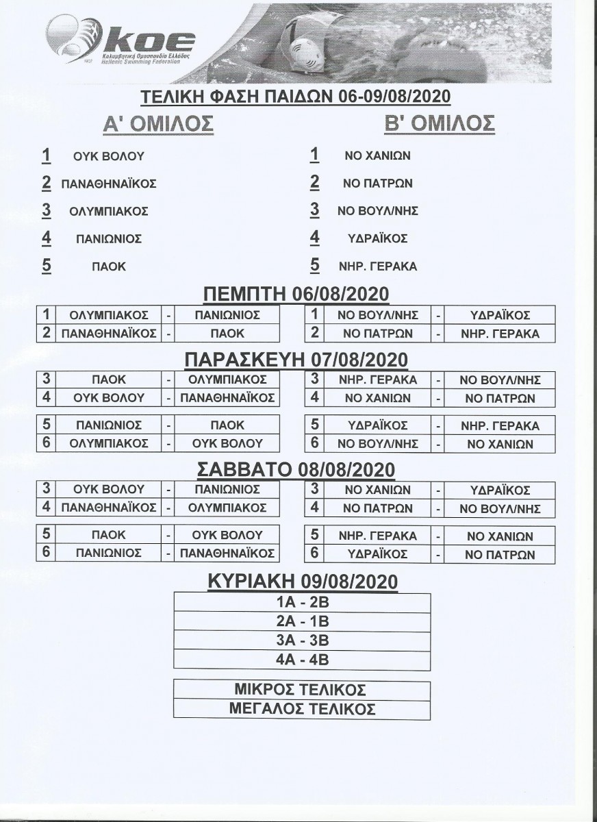 Πραγματοποιήθηκε σήμερα (22/7) με τηλεδιάσκεψη, η κλήρωση της Τελικής φάσης του Παιδικού πρωταθλήματος υδατοσφαίρισης που θα διεξαχθεί στην Αθήνα, 6 έως 9 Αυγούστου.