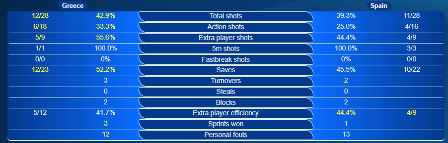 Η ομάδα του Θοδωρή Βλάχου είχε λύσεις, έπαιξε με υπομονή, βρήκε μεγάλα γκολ, σπουδαίες άμυνες και παρουσιάστηκε ως ένα σύνολο που απόψε αποφάσισε να μην παραδοθεί και να κερδίσει την εξαιρετική Ισπανία. Καθοριστικό το τρίτο οκτάλεπτο για την ψυχολογία του αγώνα, εκεί που η Ελλάδα έκανε 4-1 επιμέρους σκορ και πήρε το μομέντουμ, ενώ παρά την ισοφάριση στο φινάλε (με το 3ο ισπανικό πέναλτι), ο Στέλιος Αργυρόπουλος από δεξιά αποφάσισε να μην αφήσει το… φαγητό να κρυώσει, με την επακόλουθη διαδικασία των πέναλτι και «κεραυνοβόλησε» τον Πινέδο για το 12-11 στα 5 δευτερόλεπτα!
