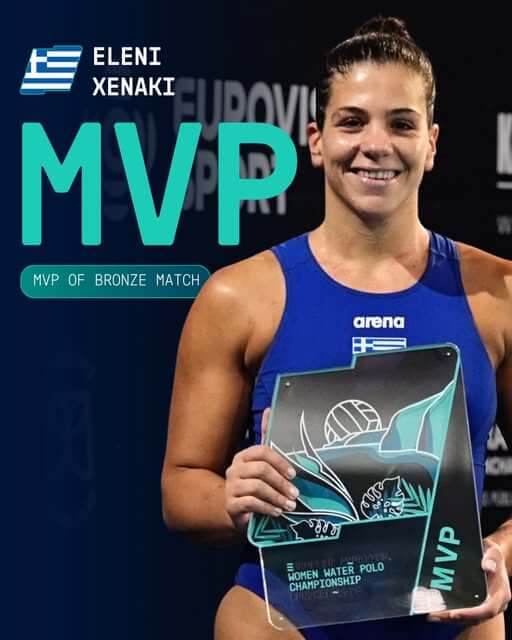 Ακόμη μία μεγάλη ατομική διάκριση για την Έλενα Ξενάκη, η οποία αναδείχθηκε MVP του αγώνα για το χάλκινο μετάλλιο στο Ευρωπαϊκό Πρωτάθλημα Υδατοσφαίρισης Γυναικών.