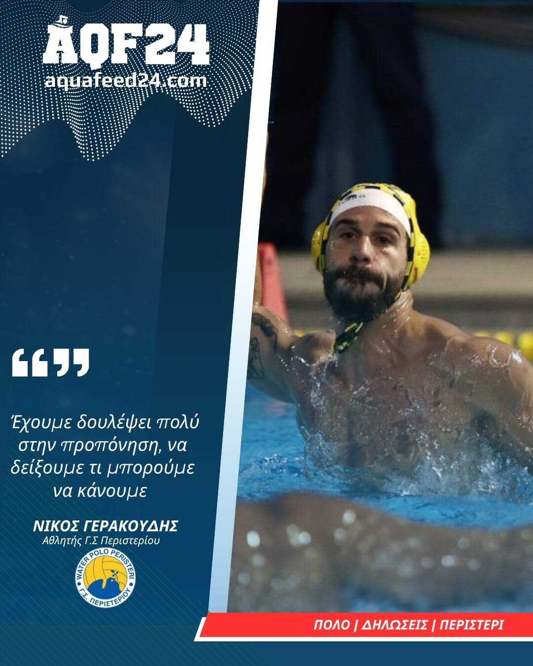 Στην Θεσσαλονίκη θα ταξιδέψει η αποστολή του Γ.Σ Περιστερίου, καθώς το Σάββατο (15/11), φιλοξενείται από τον ΟΦΘ στο Ποσειδώνιο κολυμβητήριο για την 7η αγωνιστική της Waterpolo League ανδρών. Στο πλαίσιο αυτό, παραχώρησε δηλώσεις στην επίσημη ιστοσελίδα του συλλόγου, ο Νίκος Γερακούδης και στις οποίες αναφέρθηκε στην επικινδυνότητα που «κρύβει» αυτή η αναμέτρηση κόντρα στους νεοφώτιστους του Μανολη Γούναρη, τονίζοντας πως ο ίδιος και οι συμπαίκτες του έχουν κάνει πολύ καλή δουλειά στην προπόνηση επί καθημερινής βάσεως.
