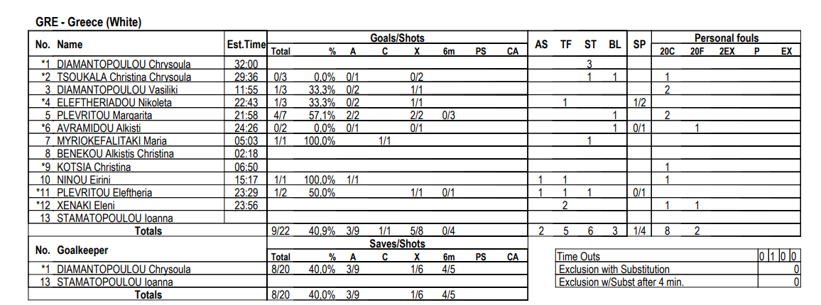 Στο 2:11 η Ελλάδα κέρδισε ποινή στην κόντρα και ο Γιώργος Μορφέσης κάλεσε τάιμ άουτ. Στο παραπάνω, η Μαργαρίτα Πλευρίτου έκανε επιθετικό φάουλ ως δεύτερο δοκάρι και η επίθεση χάθηκε.