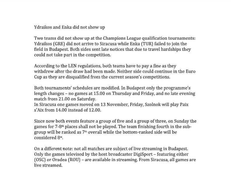 Θα μπορούσε η Ευρωπαϊκή Ομοσπονδία να αφουγκραστεί τα αντικειμενικά προβλήματα των δύο ομάδων, οι οποίες λόγω αναβολής ταξιδιών και λόγω κρουσμάτων COVID-19, δεν μπόρεσαν να παραστούν σε Συρακούσες και Βουδαπέστη, ωστόσο όχι μόνον δεν το έκανε, αλλά φρόντισε να τις τιμωρήσει όπως ορίζουν οι κανονισμοί της. Δυστυχώς, η ηγεσία της LEN, για ακόμη μια φορά δεν θέλει να εναρμονιστεί με την (εκάστοτε) εποχή και πήγε… by the book. Ακόμα και τώρα, που ο κορονωϊός προκαλεί αξεπέραστες δυσκολίες σε συλλόγους.