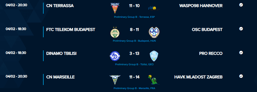 Μάλιστα, η μάχη για τα τρία εισιτήρια, εκτός της διοργανώτριας Ρέκο που προελαύνει (13-3 στην Τιφλίδα τη Ντιναμό), δείχνει να ξεκαθαρίζει, καθώς η Μλάντοστ πέτυχε μεγάλο διπλό στη Γαλλία με 14-11 επί της Μαρσέιγ και έχει κι αυτή 16 βαθμούς. Στην 5η θέση ακολουθεί η Τεράσα με 12, με τους Ισπανούς να κερδίζουν το ντέρμπι με το Ανόβερο οριακά με 11-10!