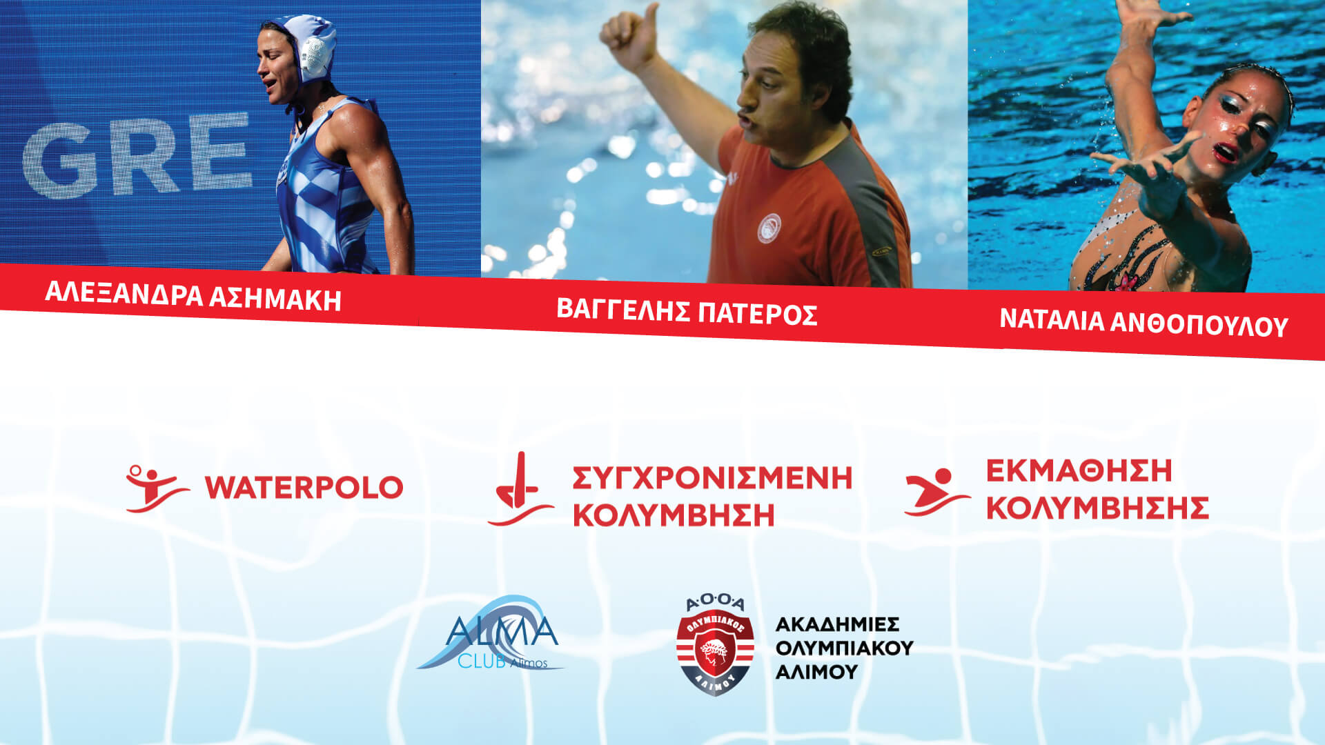 Πιο συγκεκριμένα, στο τιμόνι των τμημάτων του waterpolo βρίσκονται ο Βαγγέλης Πάτερος και η Αλεξάνδρα Ασημάκη, ενώ τη διαχείριση των τμημάτων της καλλιτεχνικής κολύμβησης ανέλαβε η Ναταλία Ανθοπούλου.