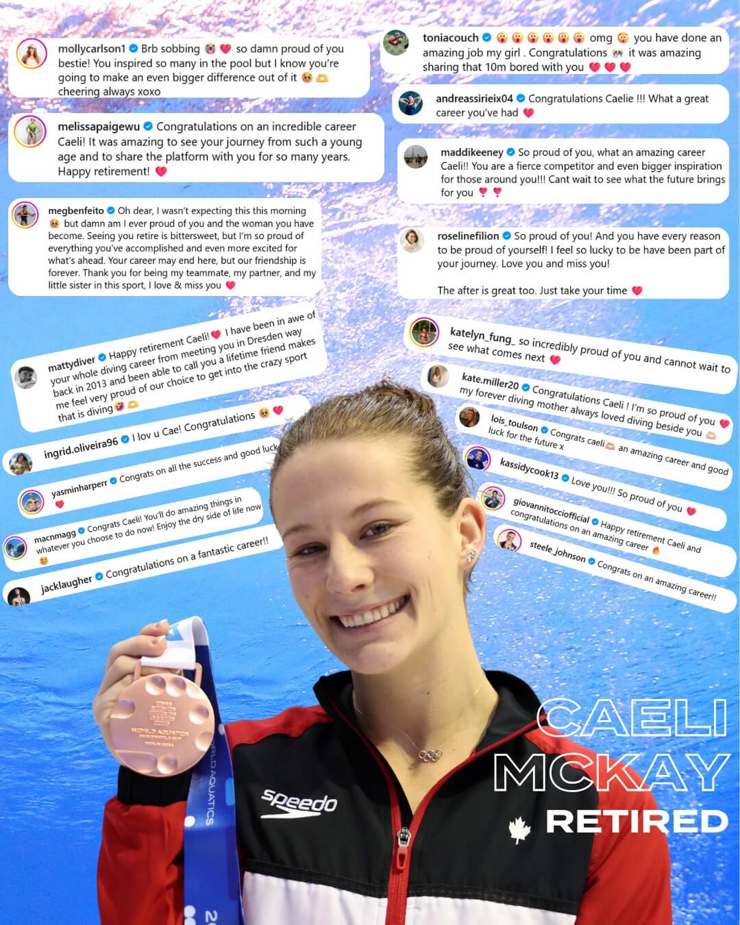 Η Καναδή καταδύτρια Caeli Sierra McKay Riendeau ανακοίνωσε ότι αποχωρεί από την ενεργό δράση, κλείνοντας ένα κεφάλαιο 20 ετών στις καταδύσεις. Την είδηση γνωστοποίησε με ανάρτησή της στο Instagram, ενώ η Diving Canada τη συνεχάρη δημόσια για την πορεία της.