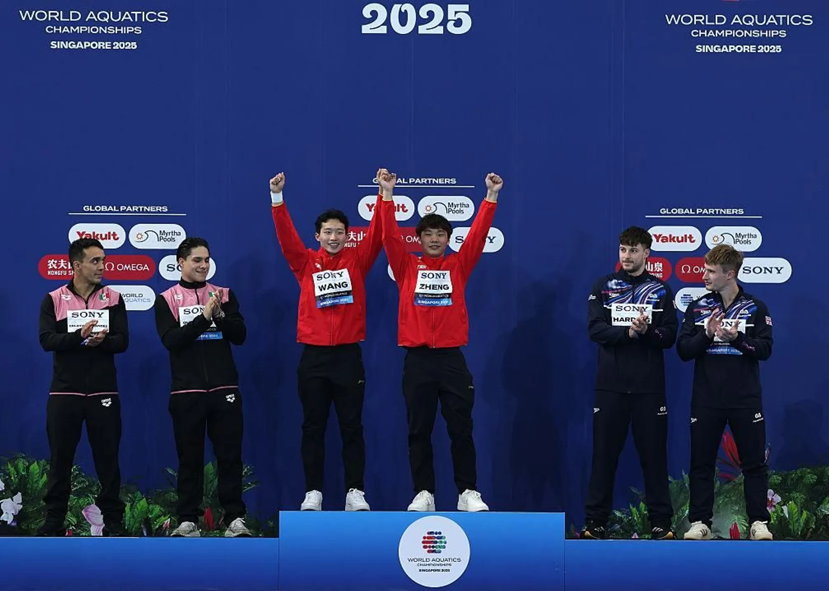 Στον τελικό των ανδρών 3μ συγχρονισμένων καταδύσεων τη Δευτέρα, οι Κινέζοι Wang Zongyuan και ο νέος του παρτενέρ Zheng Jiuyuan εντυπωσίασαν με τη σταθερότητά τους, χαρίζοντας στην Κίνα το τέταρτο χρυσό μετάλλιο στις πέντε πρώτες καταδύσεις του Παγκοσμίου Πρωταθλήματος Υγρού Στίβου στη Σιγκαπούρη.