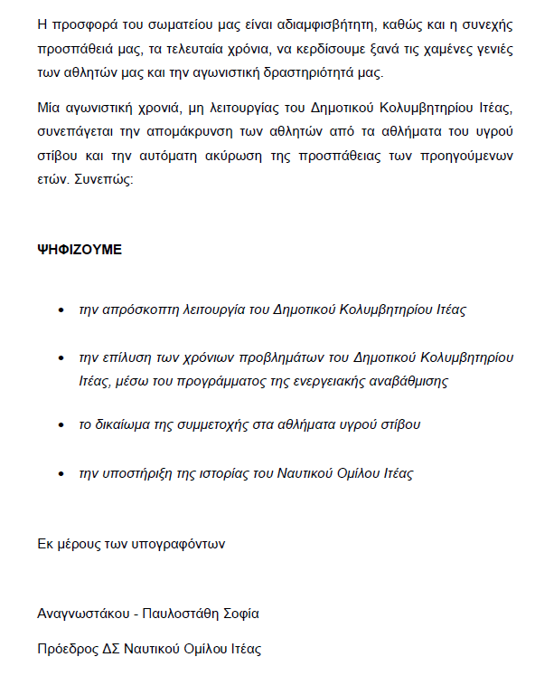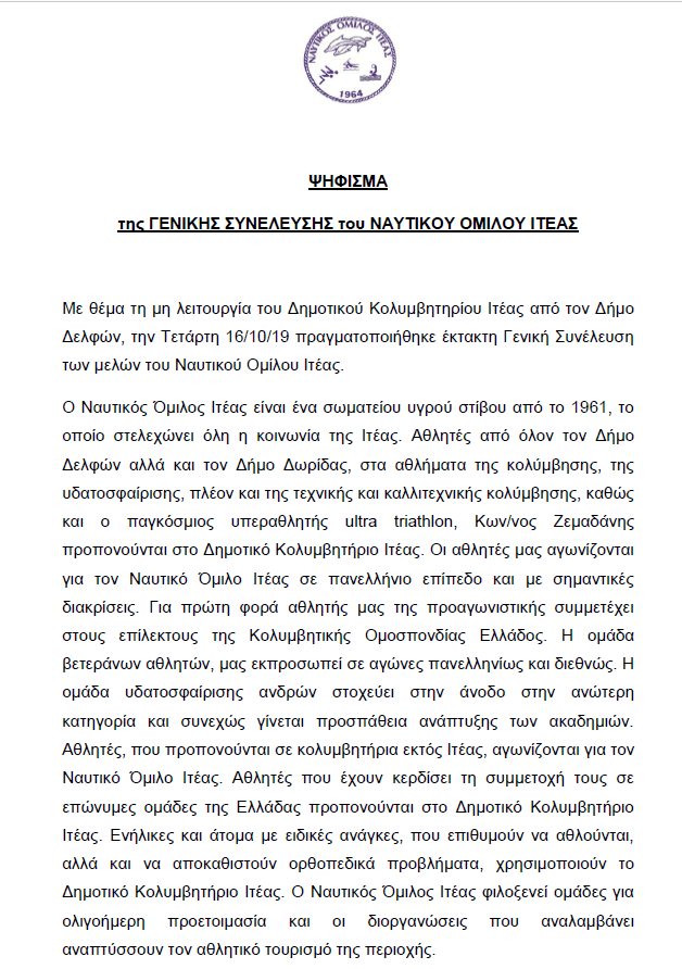 Ο ΝΟ Ιτέας που ουσιαστικά αποτελεί τον πιο ιστορικό σύλλογο της περιοχής έκανε ψήφισμα, προκειμένου να αποφευχθεί το καταστροφικό κλείσιμο της πισίνας: