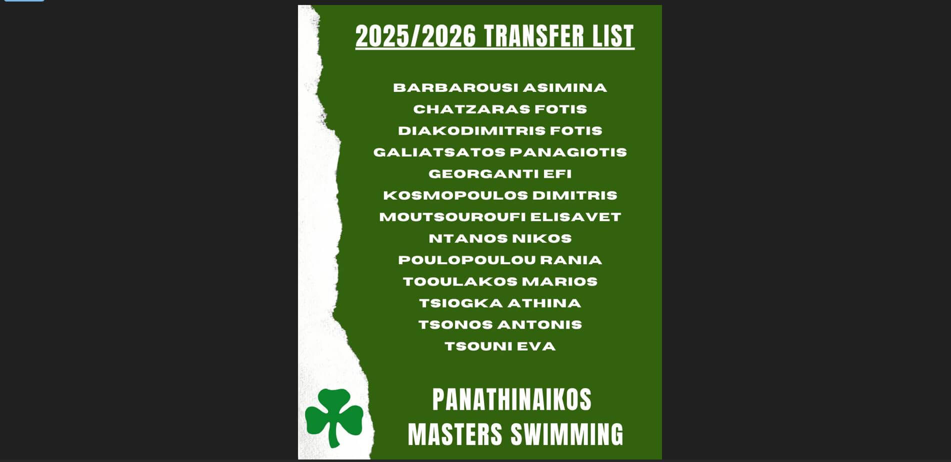Το Τμήμα Κολύμβησης Masters του Παναθηναϊκού Α.Ο. ενισχύεται με 13 νέες μεταγραφές για την αγωνιστική σεζόν 2025/2026, επιβεβαιώνοντας για ακόμη μία φορά τη σταθερή και δυναμική ανάπτυξη του τμήματος καθώς και την στοχοπροσήλωση της ομάδας για ακόμα περισσότερες επιτυχίες σε ατομικό και συλλογικό επίπεδο.