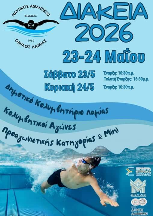 Στη Λαμία στρέφεται το ενδιαφέρον της ελληνικής κολύμβησης το διήμερο 23-24 Μαΐου 2026, με τη διεξαγωγή των αγώνων «ΔΙΑΚΕΙΑ 2026», που απευθύνονται στις μικρές ηλικιακές κατηγορίες.