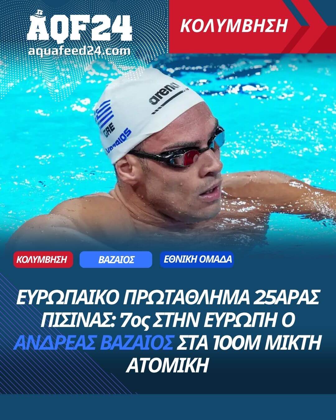 Την 7η θέση στον μεγάλο τελικό των 100μ μικτής ατομικής κατέλαβε στο Ευρωπαϊκό Πρωτάθλημα 25αρας πισίνας ο Ανδρέας Βαζαίος, καθώς σημείωσε πολύ καλό χρόνο με 51.97. Μάλιστα, ο Έλληνας αθλητής που έχει κερδίσει 10 μετάλλια εκ των οποίων τα 4 στο συγκεκριμένο αγώνισμα, βελτίωσε το ατομικό του ρεκόρ που ήταν 52.09 ενώ για πρώτη φορά στη σεζόν κατέβηκε τα 52 δευτερόλεπτα, με τον ίδιο να δηλώνει στην κάμερα της Δημόσιας Τηλεόρασης πως είναι ευχαριστημένος από την επίδοσή του. Για την ιστορία, το χρυσό μετάλλιο κρίθηκε με τη μικρότερη δυνατή διαφορά, με τον Ελβετό Νόε Πόντι να κερδίζει για ένα εκατοστό του δευτερολέπτου τον Γάλλο Μαξίμ Γκρουσέ και να κατακτά τον δεύτερο τίτλο του στο Λούμπλιν. Ο Πόντι πέτυχε και ρεκόρ αγώνων με 50.52, έναντι 50.53 του Γκρουσέ, ενώ το βάθρο συμπλήρωσε ο Αυστριακός Χάικο Γκίγκλερ με 51.60.