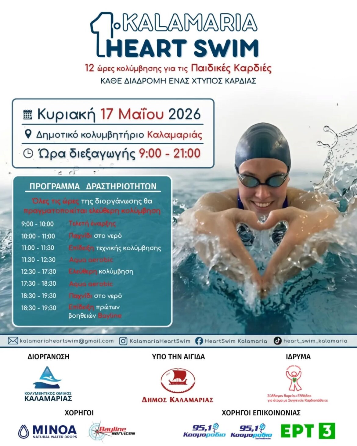 Μια ξεχωριστή φιλανθρωπική δράση έρχεται την Κυριακή 17 Μαΐου, στο Δημοτικό Κολυμβητήριο Καλαμαριάς, με στόχο τη στήριξη παιδιών με καρδιολογικά προβλήματα με διοργανωτή τον Κολυμβητικός Όμιλος Καλαμαριάς