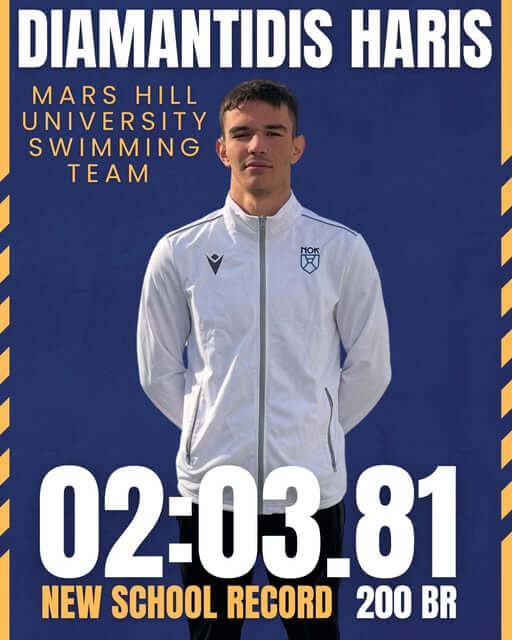 Ο Έλληνας κολυμβητής Χάρης Διαμαντίδης, αθλητής του Ναυτικού Ομίλου Κορίνθου και μέλος της κολυμβητικής ομάδας του Mars Hill University στις Ηνωμένες Πολιτείες, πραγματοποίησε μια εξαιρετική εμφάνιση που του χάρισε ένα σημαντικό ρεκόρ: την κατάρριψη του πανεπιστημιακού ρεκόρ στο αγώνισμα των 200 γιάρδων πρόσθιο.