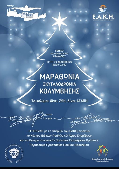 Η ΠΕΚΥΚΡ-ΕΑΚΗ διοργανώνει όπως κάθε χρόνο την καθιερωμένη Μαραθώνια Σκυταλοδρομία Κολύμβησης στο Κολυμβητήριο Ηρακλείου, σε μία δράση αλληλεγγύης και προσφοράς που θα πραγματοποιηθεί την Τρίτη 30 Δεκεμβρίου 2025.