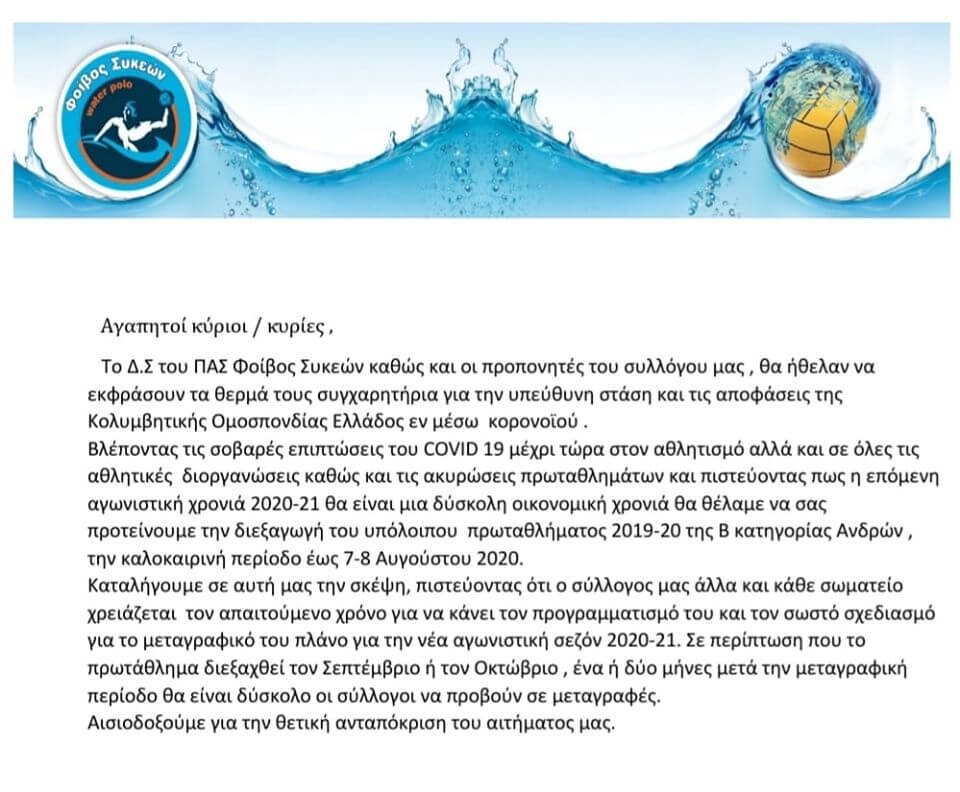 Πρόταση με αποδέκτη την Κολυμβητική Ομοσπονδία Ελλάδος έκανε ο σύλλογος Φοίβος Συκεών, όσον αφορά το πρωτάθλημα της Β κατηγορίας.