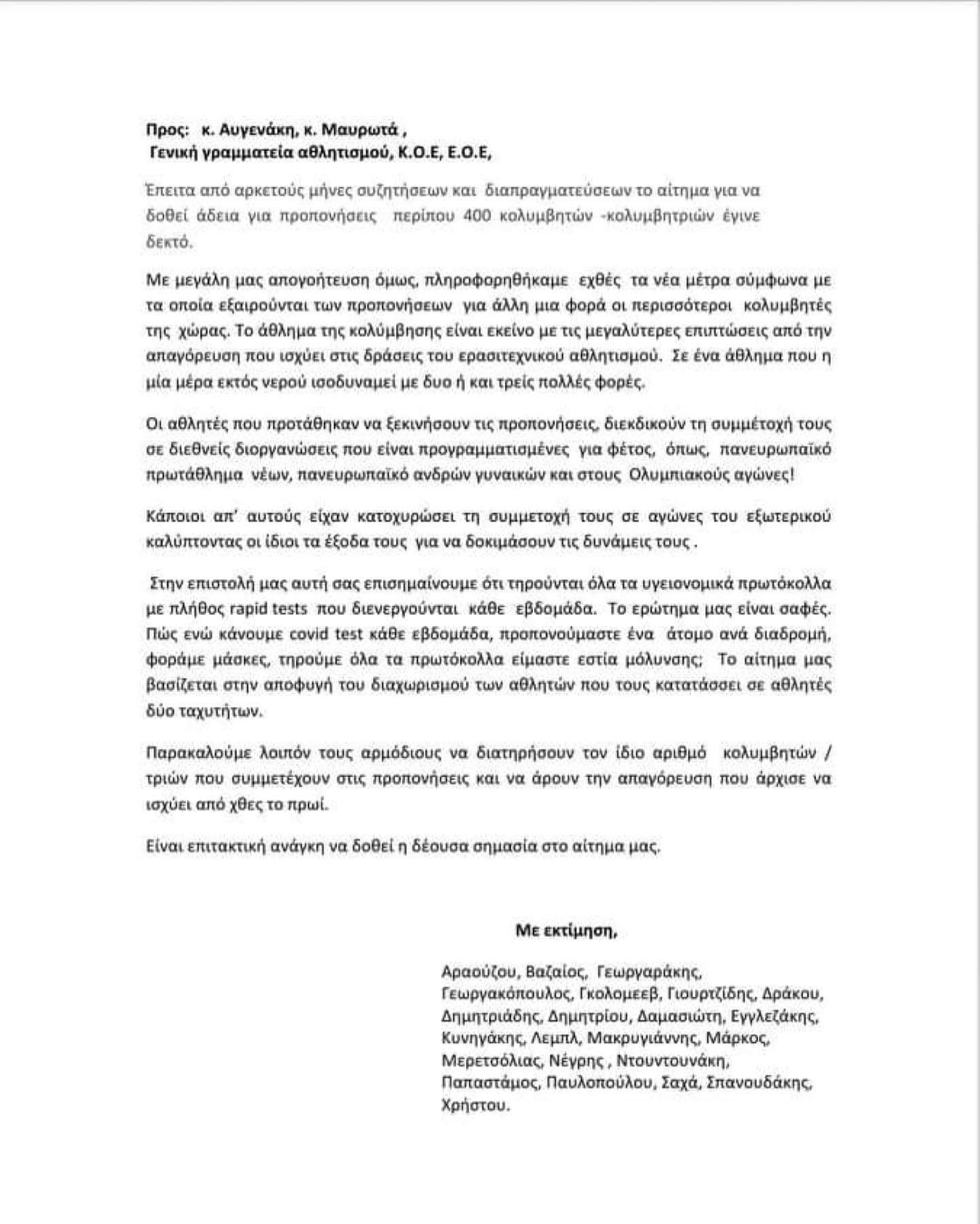 23 κορυφαία στελέχη της κλασικής κολύμβησης της χώρας απέστειλαν την Παρασκευή το πρωί επιστολή με παραλήπτες τον Υφυπουργό Αθλητισμού, τον ΓΓΑ, την ΚΟΕ και την ΕΟΕ και καλούν τους αρμόδιους να άρουν άμεσα τα απαγορευτικά μέτρα που ανακοινώθηκαν την περασμένη Τετάρτη 3 Μαρτίου. Την επιστολή υπογράφουν οι κολυμβητές Γκολομέεβ, Χρήστου, Βαζαίος, Παπαστάμος, Σπανουδάκης, Μερετσόλιας, Κυνηγάκης, Γεωργαράκης, Γεωργακόπουλος, Γκιουρτζίδης, Δημητριάδης, Δημητρίου, Εγγλεζάκης, Μάρκος, Μακρυγιάννης, Σπανουδάκης, Νέγρης και οι κολυμβήτριες Δράκου, Ντουντουνάκη, Λεμπλ, Αραούζου, Δαμασιώτη, Παυλοπούλου και Σαχά.