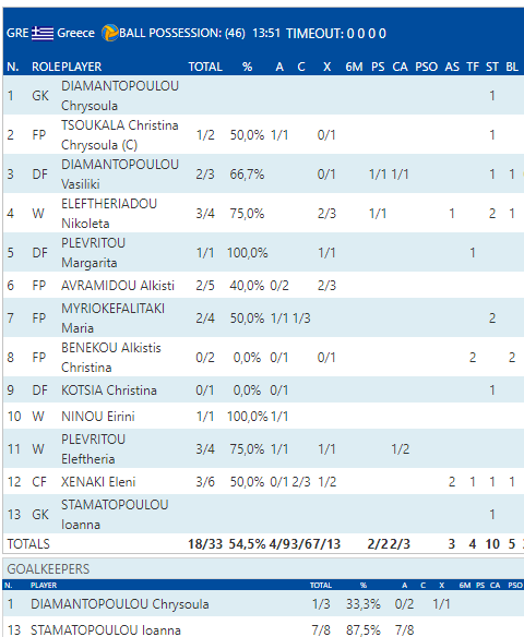 Κορυφαίο γκολ της Ελλάδας, αναμφίβολα, αυτό της Μαρίας Μυριοκεφαλιτάκη από το κέντρο, σχεδόν, της πισίνας στο τελείωμα του δεύτερου οκταλέπτου! Αγωνίστηκαν τόσο η Χρυσή Διαμαντοπούλου (1/3 αποκρούσεις) και η Ιωάννα Σταματοπούλου (7/8 αποκρούσεις), ενώ αποβλήθηκε με αντικατάσταση στο πρώτο ημίχρονο η Μαργαρίτα Πλευρίτου.