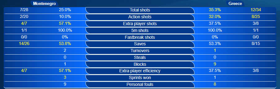 Το Μαυροβούνιο ναι μεν αγωνίζεται με απουσίες (σ.σ Δεν έπαιξε στον τελικό ο τραυματίας Ράντοβιτς παρότι ήταν στη 13άδα), ωστόσο έφτασε ως τον τελικό δίκαια και βρήκε μπροστά του μια θεαματική Ελλάδα, καθώς οι παίκτες του Θεόδωρου Βλάχου έβγαλαν στο νερό το απαύγασμα της ποιότητας τους για δεύτερο διαδοχικό παιχνίδι, για να ανέβουν στην κορυφή του βάθρου (σ.σ αναφέρεται αυτό διότι δόθηκαν μετάλλια στις τρεις πρώτες χώρες).