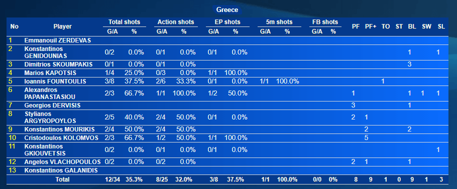 Η Ελλάδα βρήκε 8 γκολ από την περιφέρεια, είχε δηλαδή μεγάλα σουτ που ανοίγουν τις άμυνες, 3 σε παίκτη παραπάνω και 1 πέναλτι! Ο Ζερδεβάς ολοκλήρωσε με 8/15 αποκρούσεις, ενώ είχε στο πλευρό του 9 μπλοκ από τους συμπαίκτες του!