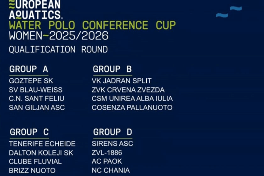 Πραγματοποιήθηκε το πρωί της Δευτέρας (11/8) στο Ζάγκρεμπ της Κροατίας η κλήρωση του νεοσύστατου από την European Aquatics, Conference Cup, με τα «βλέμματα» να είναι προφανώς στις ελληνικές ομάδες , δηλαδή στον ΠΑΟΚ και στον ΝΟ Χανίων. Πάντως, η κληρωτίδα είχε.. κέφια, καθώς μετά την ολοκλήρωση της διαδικασίας οι δύο εκπρόσωποι της ελληνικής γυναικείας υδατοσφαίρισης στην διοργάνωση, τοποθετήθηκαν στον ίδιο όμιλο και συγκεκριμένα στον 4ο όμιλο.