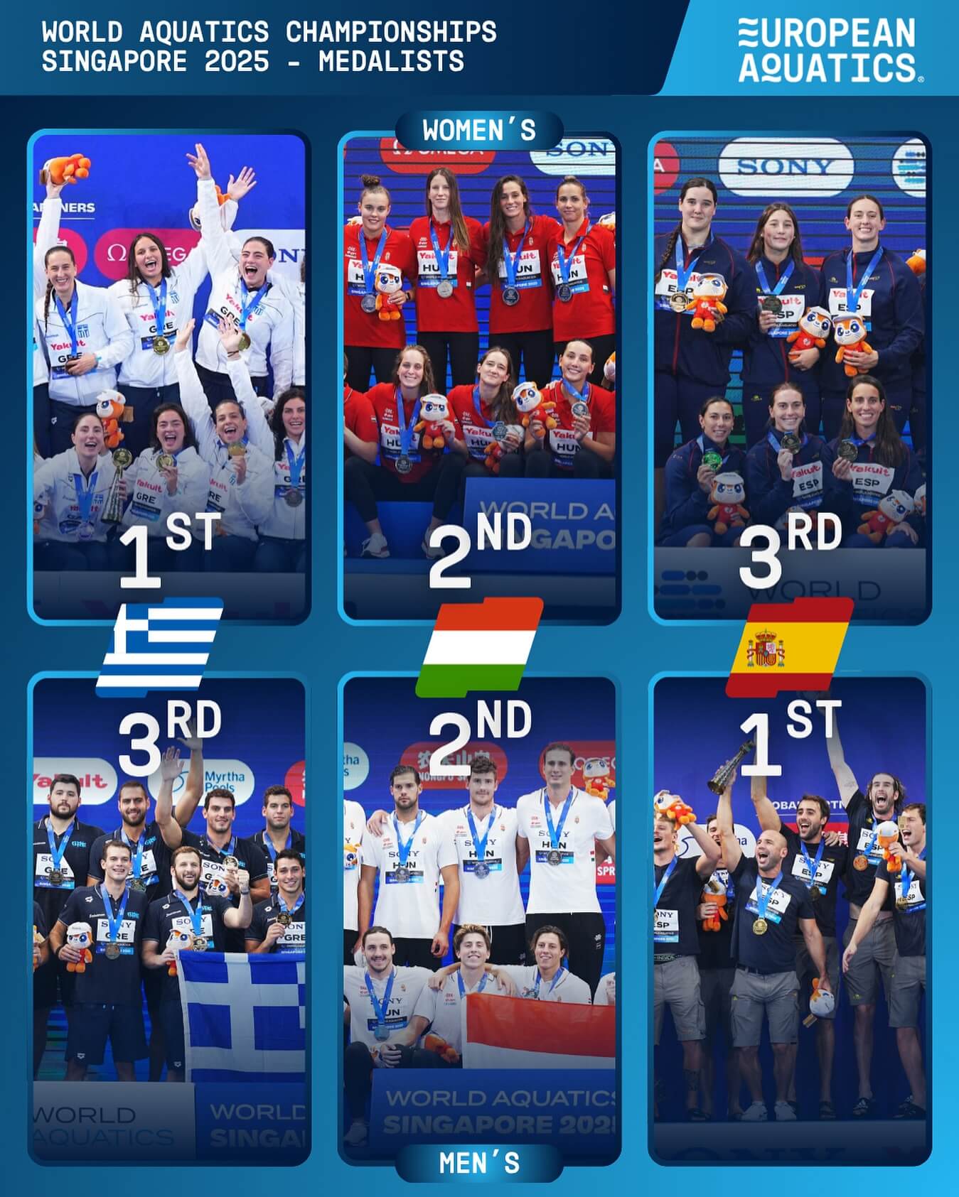 Στο πρόσφατο Παγκόσμιο πρωτάθλημα στην Σιγκαπούρη, 3 ομάδες μοιράστηκαν τις 3 πρώτες θέσεις και τα μετάλλια. Είναι πολύ ωραίο καθώς και οι 3 χώρες βρίσκονται στην Ευρώπη. Η Ελλάδα πήρε το χρυσό στις γυναίκες και το αργυρό στους άνδρες , η Ισπανία το ακριβώς αντίθετο και η Ουγγαρία, δύο χάλκινα!!