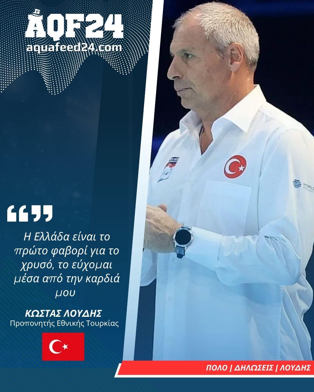 Η Εθνική Ομάδα δεν είχε πρόβλημα κόντρα στην Τουρκία, την κέρδισε εύκολα με 20-8 και έκανε ένα ακόμη βήμα για την 4αδα του Ευρωπαϊκού Πρωταθλήματος που διεξάγεται στο Βελιγράδι. Παρόλα αυτά, η αναμέτρηση είχε διπλό ενδιαφέρον, καθώς στον πάγκο της Τουρκίας κάθεται ο Κώστας Λούδης, που έχει συμμετάσχει τέσσερις φορές σε Ολυμπιακούς Αγώνες, φορώντας το σκουφάκι με το εθνόσημο. Λίγο μετά την λήξη του αγώνα λοιπόν, έδωσε δηλώσεις στην κάμερα της ΕΡΤ και στις οποίες έχρισε την ελληνική ομάδα για το χρυσό μετάλλιο, χαρακτηρίζοντάς την πλήρη ομάδα που μπορεί να φτάσει μέχρι το τέλος του δρόμου στην Σερβία.