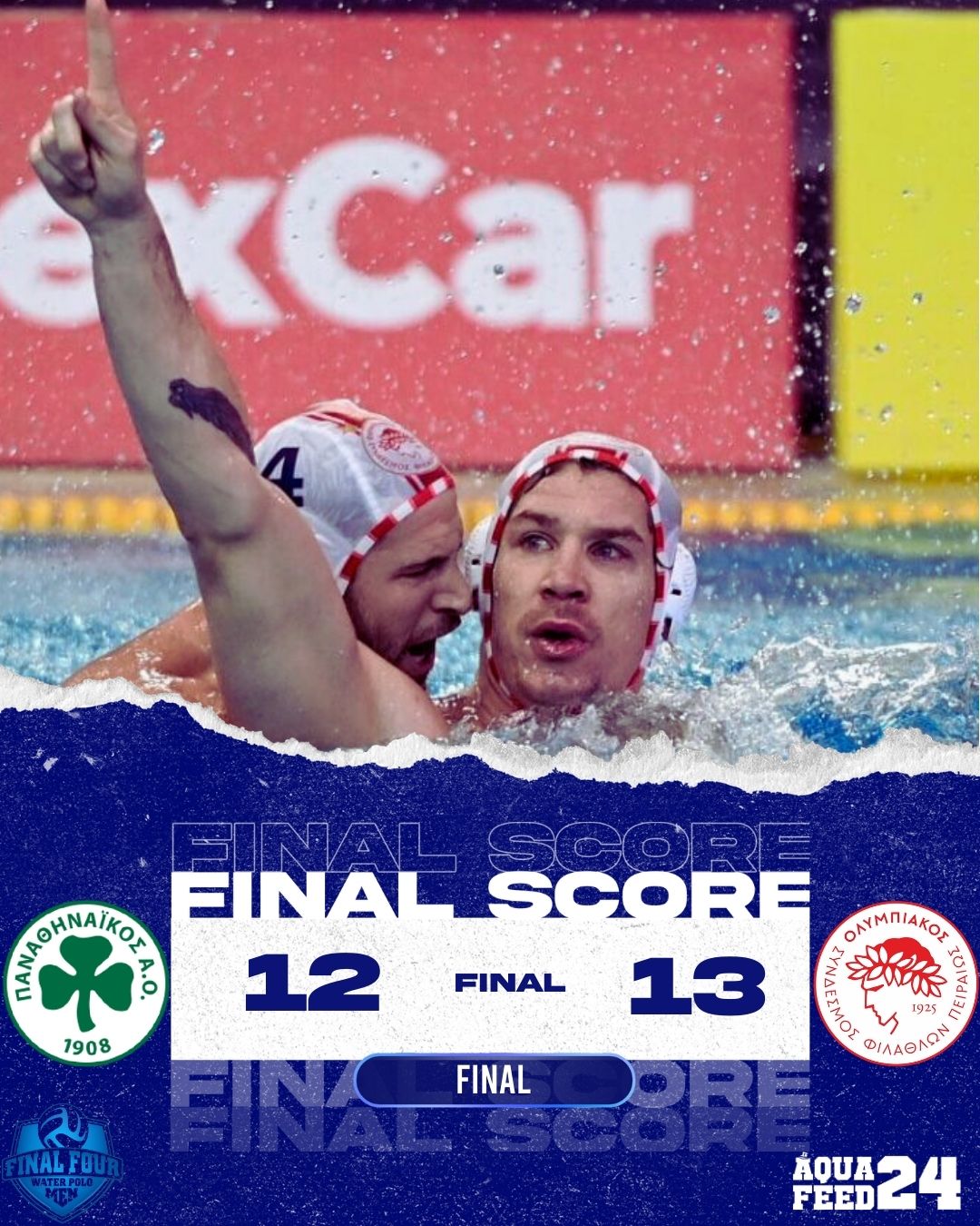 Σε ένα σπουδαίο παιχνίδι που διεξήχθη στο κολυμβητήριο της Στρατιωτικής Σχολής Ευελπίδων, ο Ολυμπιακός επικράτησε του Παναθηναϊκού με 13-12 στον τελικό του Final-4, κατακτώντας το 27ο κύπελλο της ιστορίας του. Το ματς ήταν ντέρμπι καθ΄όλη την διάρκεια των τεσσάρων οκταλέπτων, όμως ένα τέρμα του Ντίνου Γενηδουνιά 19 δευτερόλεπτα πριν την λήξη, έδωσε το τρόπαιο στην ομάδα του Έλβις Φάτοβιτς, με τις δύο ομάδες να προσφέρουν πλούσιο θέαμα με πολύ όμορφα γκολ εκατέρωθεν.