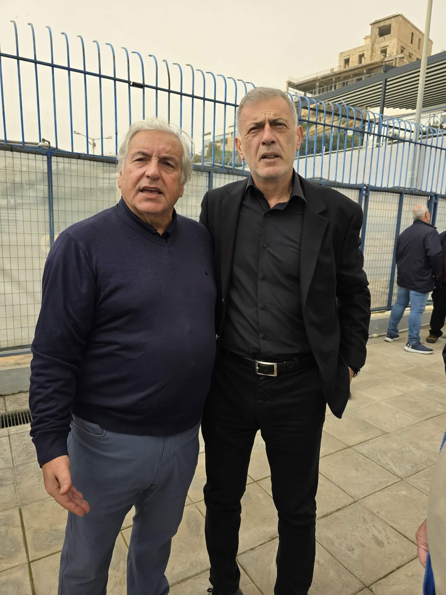 Ο Δήμαρχός Πειραιά Γιάννης Μώραλης με τον παλιό διεθνή πολίστα του Εθνικού Γιάννη Γαρύφαλλο.
