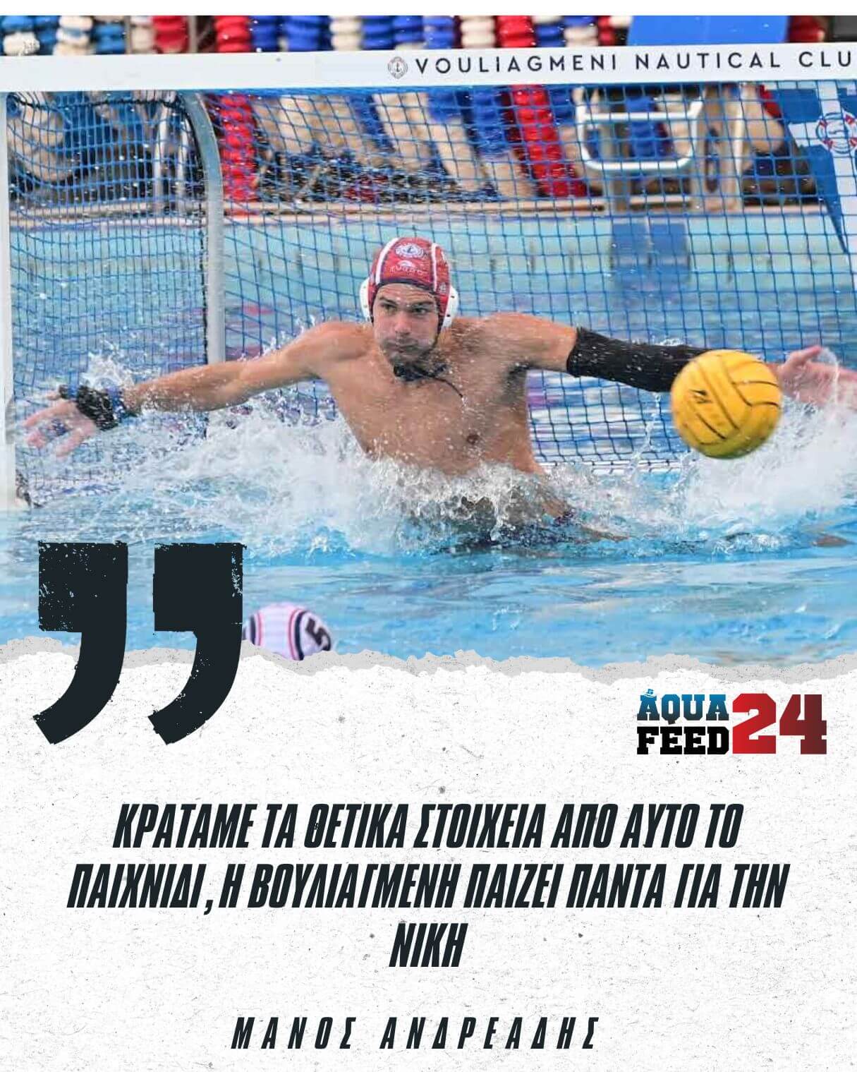 Αμέσως μετά τη λήξη της αναμέτρησης λοιπόν, παραχώρησε δηλώσεις στην κάμερα της ΕΡΤ ο τερματοφύλακας του ΝΟΒ, Μάνος Ανδρεάδης και στις οποίες εξέφρασε την ικανοποίησή του για την αντίδραση των συμπαικτών του μετά το τελευταίο ανεπιτυχές αποτέλεσμα κόντρα στον Απόλλωνα Σμύρνης στο Σεράφειο (σ.σ ήττα με 12-10). Παρόλα αυτά, ο διεθνής (χάλκινος στο Παγκόσμιο πρωτάθλημα της Σιγκαπούρης το περασμένο καλοκαίρι) πορτιέρε των «Μπέμπηδων», τόνισε πως η ιστορία του συλλόγου επιτάσσει πως σε κάθε ματς ο στόχος είναι η νίκη ενώ έδωσε και το σύνθημα για τα επόμενα παιχνίδια του ΝΟ Βουλιαγμένης στην Waterpolo League Ανδρών.