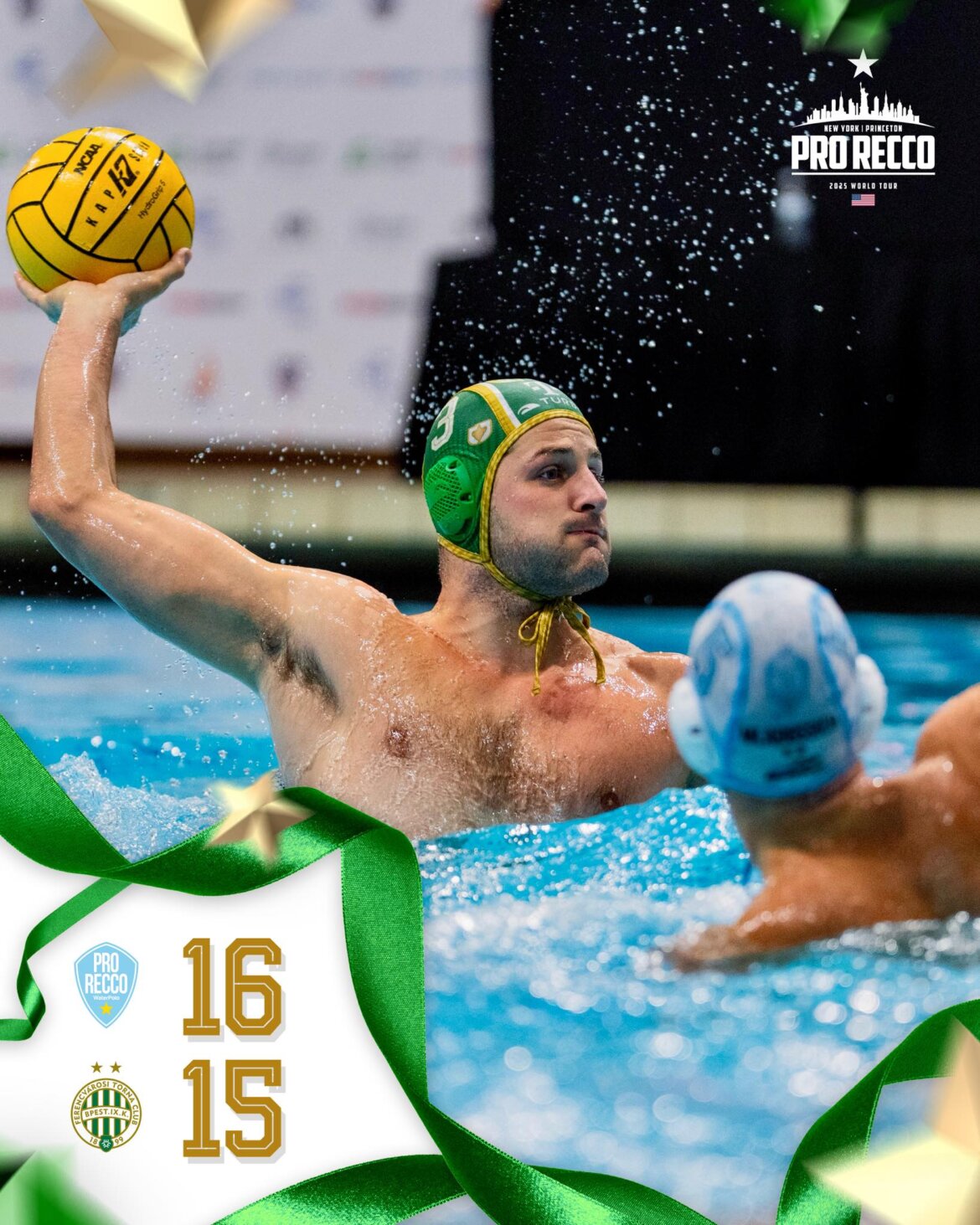 Σε ένα ματς-βιτρίνα για το ευρωπαϊκό πόλο στις ΗΠΑ, η FTC-Telekom λύγισε στο φινάλε από την Pro Recco με 16–15, σε ένα παιχνίδι που είχε νεύρο, ποιότητα και συνεχείς εναλλαγές. Οι «πράσινοι» προηγήθηκαν νωρίς στο β’ οκτάλεπτο, βρέθηκαν να κυνηγούν μέχρι και στο –3, γύρισαν με την τριάδα Μάνχερτς–Γιανσίκ–Βάμος, ισοφάρισαν δύο φορές με βολίδες των Νάγκι και Βάργκα, όμως η τελευταία κουβέντα ανήκε στους Ιταλούς.