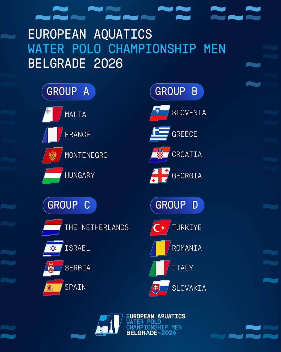 Η κλήρωση ολοκληρώθηκε και οι 16 εθνικές ομάδες μοιράστηκαν σε 4 ομίλους των τεσσάρων. Το Ευρωπαϊκό θα διεξαχθεί στο Βελιγράδι, 10–25 Ιανουαρίου 2026, με νέο σύστημα διεξαγωγής: μετά την Α’ φάση, οι τρεις πρώτοι από κάθε όμιλο προχωρούν σε Β’ ομίλους (E & F) και δεν υπάρχουν προημιτελικά – οι δύο πρώτοι κάθε Β’ ομίλου πάνε κατευθείαν στα ημιτελικά.