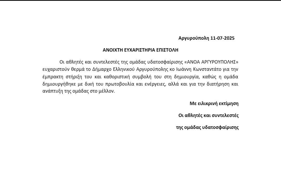 Με επιστολή που έστειλαν στον Δήμαρχο Έλληνικού Αργυρούπολης, Ιώάννη Κωνσταντάτο, οι υπευθυνοι του τμήματος πόλο του Α.Ν.Ο.Α., θέλησαν να ευχαριστήσουν για την βοήθεα που προσφέρει ο ίδιος ο υπέυθυνος αθλητισμού Βαγγέλης Νικοθώδης και συνολικά ο Δήμος στο τμήμα πόλο του συλλόγου.