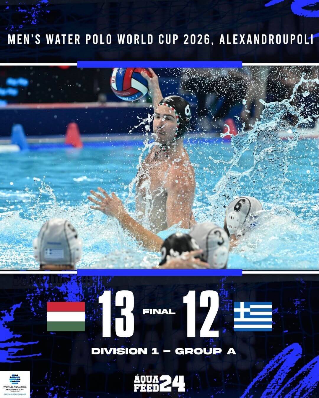 Με τέρμα του Burian στον παίκτη παραπάνω 6 δευτερόλεπτα πριν το τέλος, η Εθνική Ομάδα Υδατοσφαίρισης των Ανδρών ηττήθηκε από την Ουγγαρία με 13-12 στο «Δημοσθένης Μιχαλεντζάκης», στην πρεμιέρα της στον πρώτο όμιλο των προκριματικών του World Cup Ανδρών.