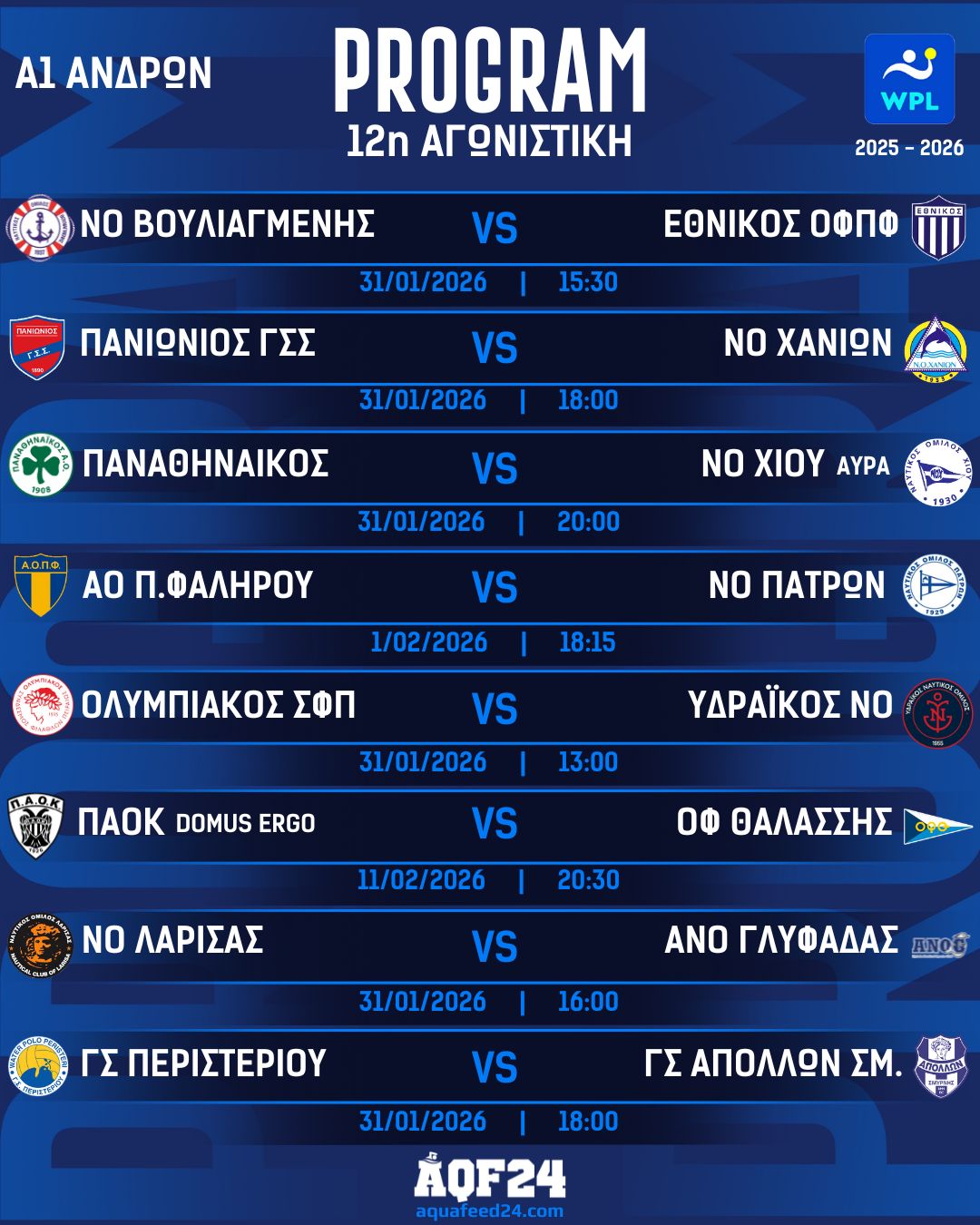 Σε τρεις δόσεις είναι χωρισμένη η 12η αγωνιστική της WPL Μen, με έξι παιχνίδια να διεξάγονται το Σάββατο (31/1), ένα την Κυριακή (1/2) και ένα ακόμη την Τετάρτη (11/2). Υπενθυμίζεται πως σε αυτήν την αγωνιστική, την πρώτη μετά το Ευρωπαϊκό Πρωτάθλημα του Βελιγραδίου, παίκτες και διαιτητές θα φορέσουν T-shirt με το σύνθημα ΟΧΙ ΣΤΗ ΒΙΑ. Επίσης, λόγω του τραγικού δυστυχήματος με την απώλεια επτά φιλάθλων του ΠΑΟΚ, θα τηρηθεί ενός λεπτού σιγή, ενώ αναβλήθηκε το παιχνίδι ΠΑΟΚ-ΟΦΘ, ύστερα από αίτημα του Ερασιτέχνη ΠΑΟΚ.