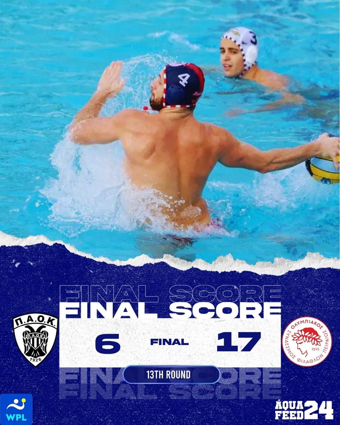 Πραγματοποιώντας ένα εξαιρετικό δεύτερο ημίχρονο, ο Ολυμπιακός έφυγε με το διπλό από την Θεσσαλονίκη, καθώς επικράτησε του ΠΑΟΚ με 17-6 στο Ποσειδώνιο, σε αναμέτρηση για την 13η αγωνιστική της Waterpolo League ανδρών.