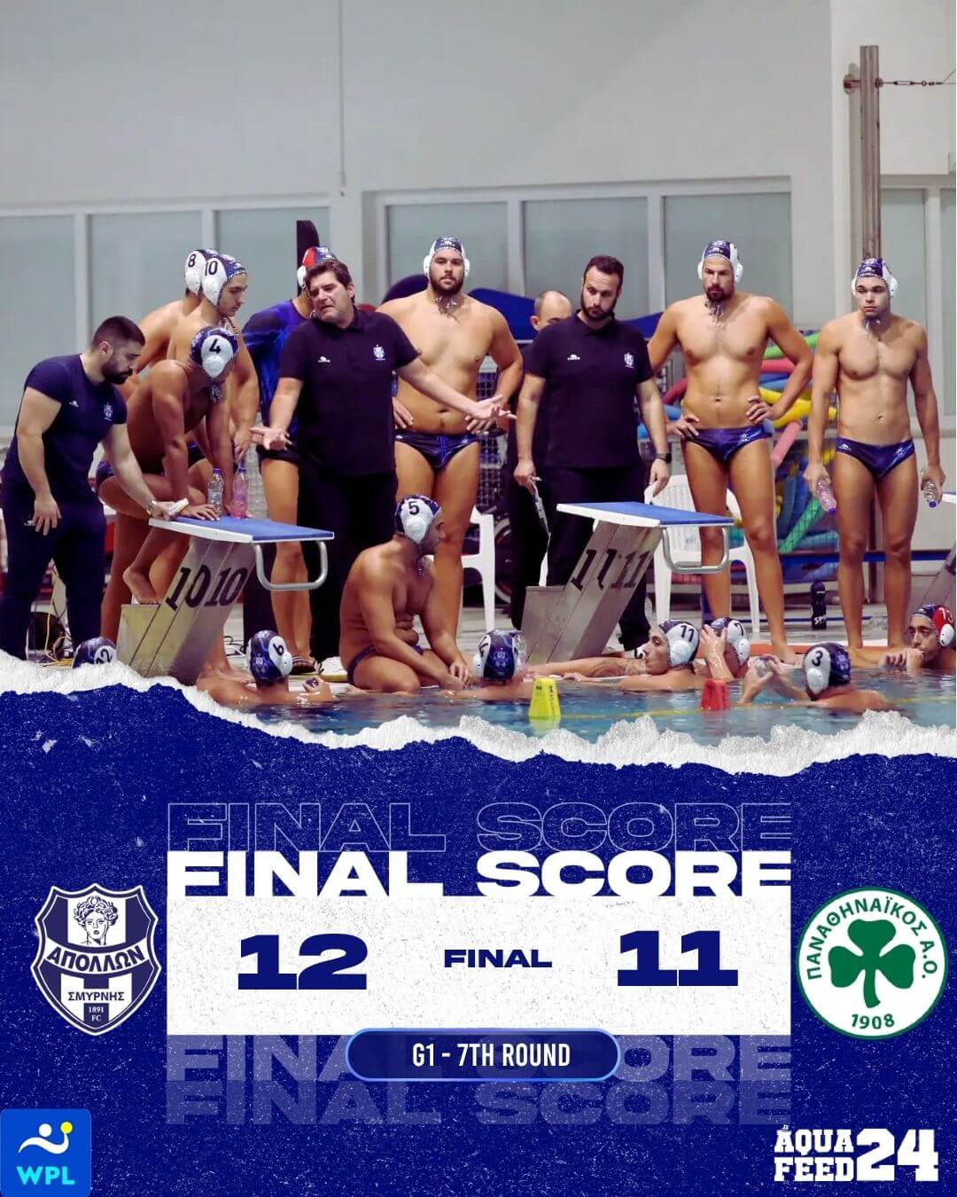 Σπουδαία νίκη πανηγύρισε το βράδυ της Τετάρτης (1/4) ο Απόλλων Σμύρνης, καθώς επικράτησε με 12-11 του Παναθηναϊκού στο Σεράφειο κολυμβητήριο, στο πλαίσιο της 7ης αγωνιστικής της Β’ φάσης της Waterpolo League Ανδρών. Με αυτό το αποτέλεσμα, η ομάδα του Τεό Λοράντου απέκτησε πολύ σημαντικό προβάδισμα για την κατάληψη της 3ης θέσης, καθώς αποσπάστηκε τρεις βαθμούς από τον 4ο πλέον ΝΟ Βουλιαγμένης, ενώ την τελευταία αγωνιστική (8η), θα αντιμετωπίσει το Παλαιό Φάληρο στο Ρέστειο κολυμβητήριο, σε ένα ματς που είναι το ξεκάθαρο φαβορί για την νίκη.