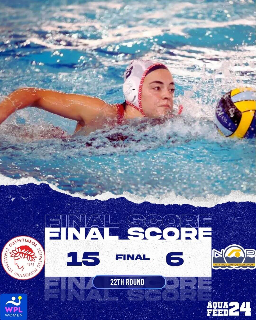 Με τον καλύτερο τρόπο ολοκλήρωσε την κανονική περίοδο της Waterpolo League γυναικών ο Ολυμπιακός, καθώς επικράτησε πολύ εύκολα του ΝΟ Ρεθύμνου με 15-6 στο Παπαστράτειο κολυμβητήριο, στο πλαίσιο της 22ης αγωνιστικής του πρωταθλήματος.
