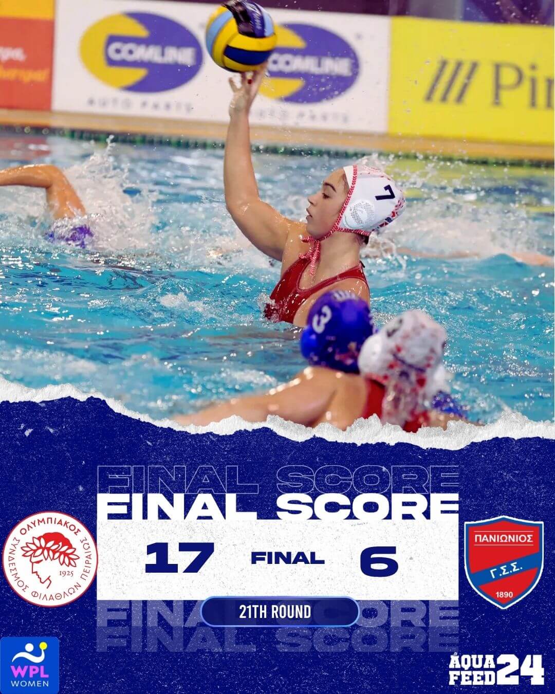 Χωρίς να αφήσει κανένα περιθώριο αμφισβήτησης της κυριαρχίας του, ο Ολυμπιακός επικράτησε εύκολα του Πανιωνίου στο Παπαστράτειο κολυμβητήριο με 17-6, σε αναμέτρηση για την 21η αγωνιστική της Waterpolo League γυναικών.