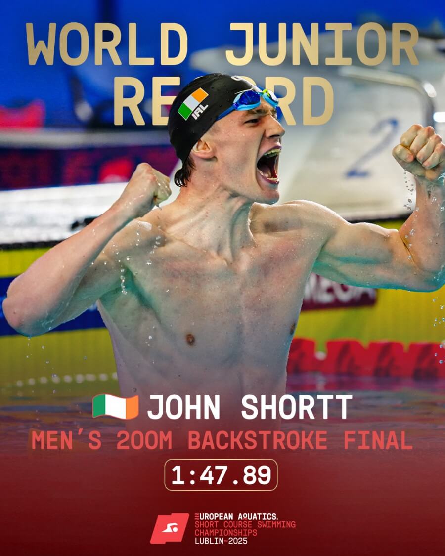 Ο Ιρλανδός John Shortt, μόλις 18 ετών, κατέκτησε το χρυσό μετάλλιο στα 200μ ύπτιο στο Ευρωπαϊκό Πρωτάθλημα 25μ στο Λούμπλιν, σημειώνοντας το εντυπωσιακό 1:47.89. Η επίδοση αυτή αποτελεί νέο Παγκόσμιο Ρεκόρ Εφήβων, επιβεβαιώνοντας ότι ο Shortt είναι ένα από τα μεγαλύτερα ανερχόμενα ταλέντα του παγκόσμιου ύπτιου.