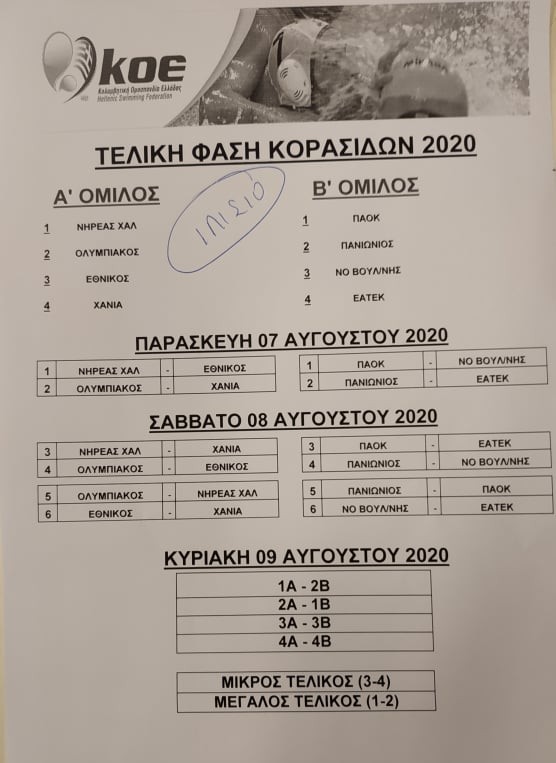 Πραγματοποιήθηκε σήμερα (29/7) η κλήρωση των αγώνων της Τελικής φάσης του πρωταθλήματος Κορασίδων υδατοσφαίρισης που θα διεξαχθεί 8-7-9 Αυγούστου στο Δημοτικό κολυμβητήριο Ιλισίων.