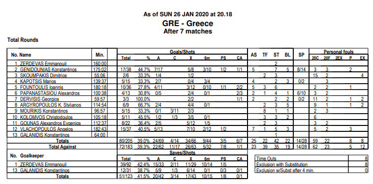 Στις εστίες, ο Μανώλης Ζερδεβάς ολοκλήρωσε το τουρνοθά με 39/92 αποκρούσεις και ο Κώστας Γαλανίδης με 12/31. Ο πρώτος έπαιξε 160 λεπτά και ο δεύτερος 64.