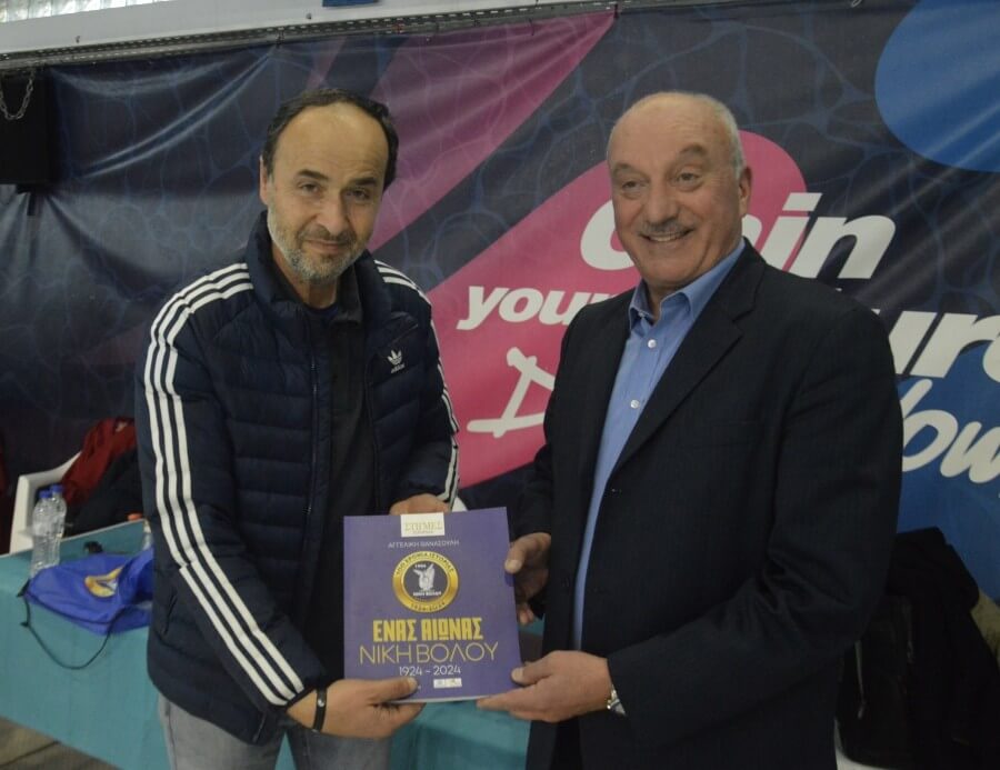 Ιδιαίτερη ήταν και η στιγμή της ανταλλαγής αναμνηστικών, με τον Πρόεδρο της Νίκης Βόλου, Ιορδάνη Χατζηεφραιμίδη, να προσφέρει στον Κυριάκο Γιαννόπουλο το επετειακό βιβλίο για τα 100 χρόνια ιστορίας του συλλόγου, καθώς και αναμνηστικό έπαθλο με το έμβλημα της Νίκης.