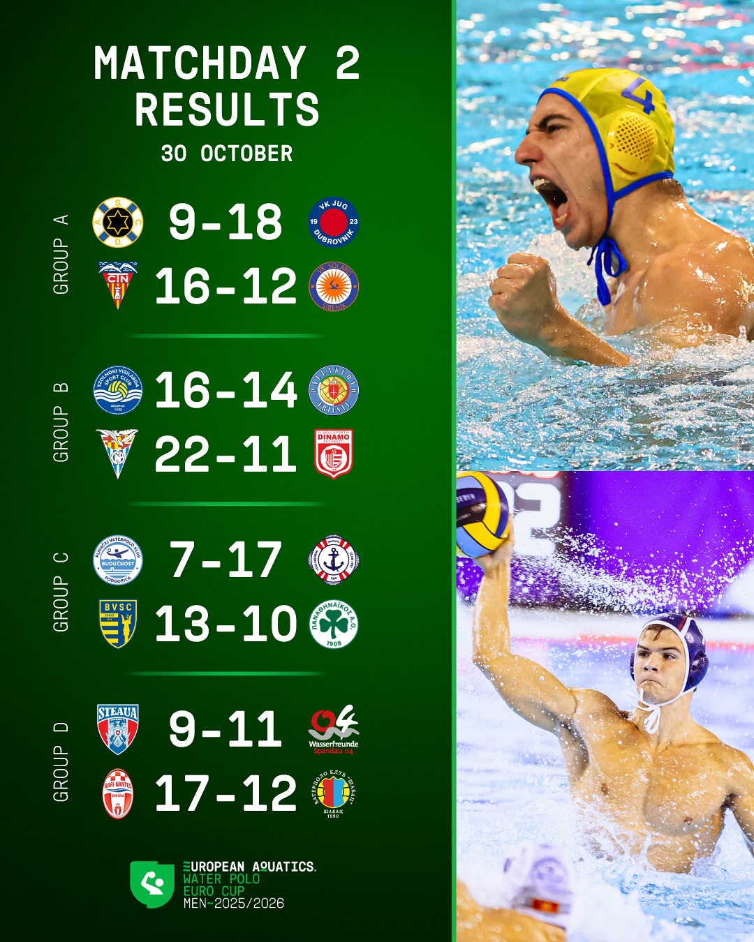 Η BVSC πραγματοποίησε εντυπωσιακή ανατροπή στο δεύτερο ημίχρονο και νίκησε τον Παναθηναϊκό με εκπληκτική εμφάνιση στο Group C της δεύτερης αγωνιστικής του Euro Cup Ανδρών. Η RN Savona πέτυχε επίσης εντός έδρας ανατροπή απέναντι στη VK Sabac Elixir, ενώ ξεχώρισαν και οι νίκες της Szolnoki Dozsa Praktiker επί της Pallanuoto Trieste και της Spandau 04 Berlin εκτός έδρας απέναντι στη Steaua Bucharest.